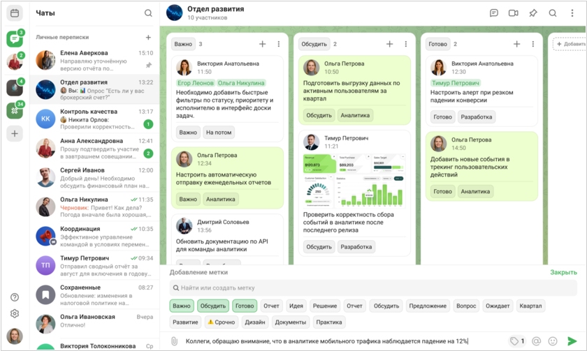 В платформе корпоративных коммуникаций Frisbee появился новый инструмент для управления задачами - таск-менеджер FrisbeeFlow, интегрированный непосредственно в интерфейс мессенджера. Этот инструмент позволяет визуально организовывать рабочие процессы и отслеживать выполнение задач с помощью проектных досок. Запуск FrisbeeFlow стал ответом на растущий спрос бизнеса на импортозамещение и интегрированные решения для командной работы после ухода с рынка популярных западных решений. Особенность инструмента - отсутствие отдельного сервиса. Все карточки на доске таск-менеджера FrisbeeFlow являются обычными сообщениями чата, а сама доска выступает альтернативным режимом просмотра переписки. Все изменения - создание карточек, смена статусов, комментарии - автоматически синхронизируются с чатом, обеспечивая прозрачность коммуникации.