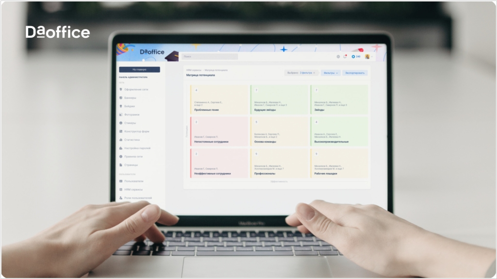 На платформе DaOffice появился раздел HRM-сервисы для управления результативностью сотрудников, развития кадрового резерва и принятия управленческих решений на основе данных. На данный момент доступно 4 сервиса: Целеполагание (позволяет формировать цели для сотрудников на период, отслеживать процент их достижения), Матрица потенциала (инструмент для системного управления кадровым резервом), Опросы (позволяет собирать структурированную обратную связь от руководителей и сотрудников) и Perfomance Review (итоговый отчет за период, который объединяет результаты по целям, оценке и позиции в матрице потенциала). Сервисы взаимодействуют с профилями сотрудников а портале и собирают данные для HR-аналитики.