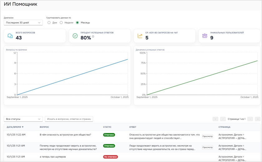 Компания Документерра представила октябрьское обновление своей вики-системы, главной новинкой которого стала аналитика ИИ Помощника. Встроенный в документацию, ИИ Помощник помогает пользователям мгновенно находить ответы, а теперь также показывает, какие вопросы задаются чаще всего, насколько полезны ответы и где есть точки роста. Это позволяет командам принимать решения на основе данных и улучшать как документацию, так и продукт. Кроме того, Документерра анонсировала новые разработки: встраивание ИИ Помощника в сайты и приложения, а также полный редизайн интерфейса для чтения документации с акцентом на скорость, SEO и удобство. Также появились ежемесячные уведомления о продлении подписки, чтобы клиенты всегда были в курсе сроков.Обновление уже доступно.Подробнее об обновлении: