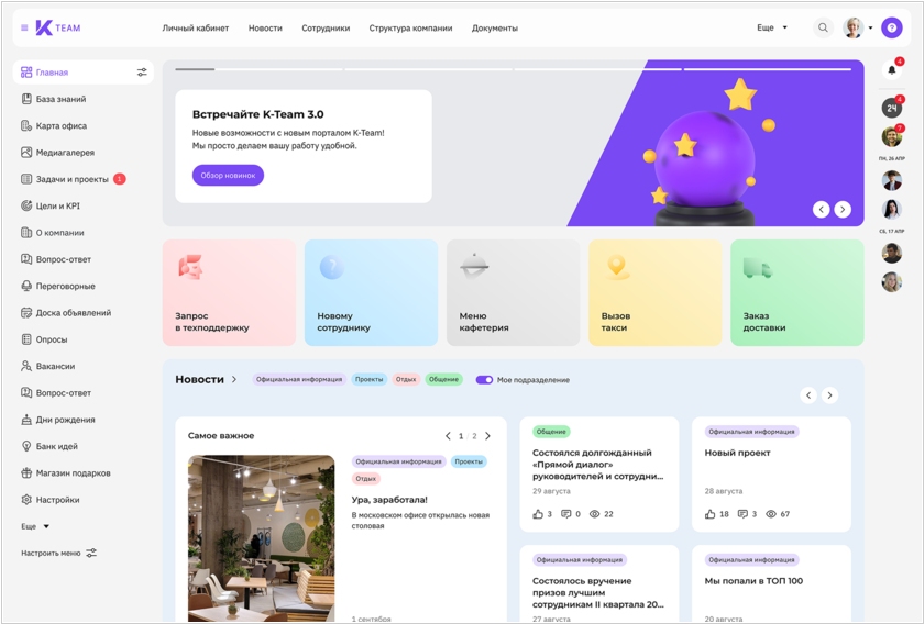 КОРУС Консалтинг представила новый релиз HRM-платформы K-Team на базе «1С-Битрикс24». На платформе появился конструктор главной страницы, который позволяет легко настраивать рабочее пространство. Теперь каждый сотрудник может настраивать рабочее пространство под себя: добавлять, перемещать и изменять виджеты - «Баннер», «Новости», «Быстрые ссылки», «Новые сотрудники», «Дни рождения», «Лучшие сотрудники» и «График отпусков». Главная страница стала максимально персонализированной: можно выбрать нужный размер, представление и функциональность каждого блока. Конструктор позволяет гибко, быстро и без помощи ИТ-специалистов создать собственный интерфейс. Также, в новой версии повился умный чат-бот Buddy, модуль «Обучение», а также функция «брендирование системы в 1 клик». Все обновления доступны в мобильной и десктопной версиях.