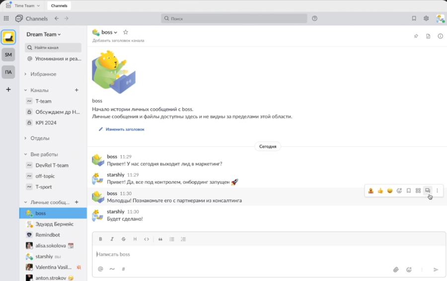 Корпоративный мессенджер от Т-Банка. Предоставляет чаты для команд и проектов, каналы для объявлений и новостей, статусы доступности, настраиваемые уведомления, передача файлов и видеозвонки. Есть API для интеграции с корпоративными сервисами.